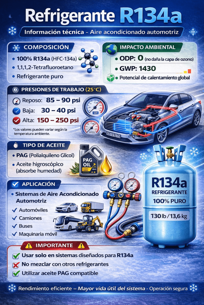 El refrigerante R134a (1,1,1,2-tetrafluoroetano) es ampliamente utilizado en sistemas de aire acondicionado automotriz, así como en equipos de refrigeración doméstica y comercial en Honduras y a nivel mundial.